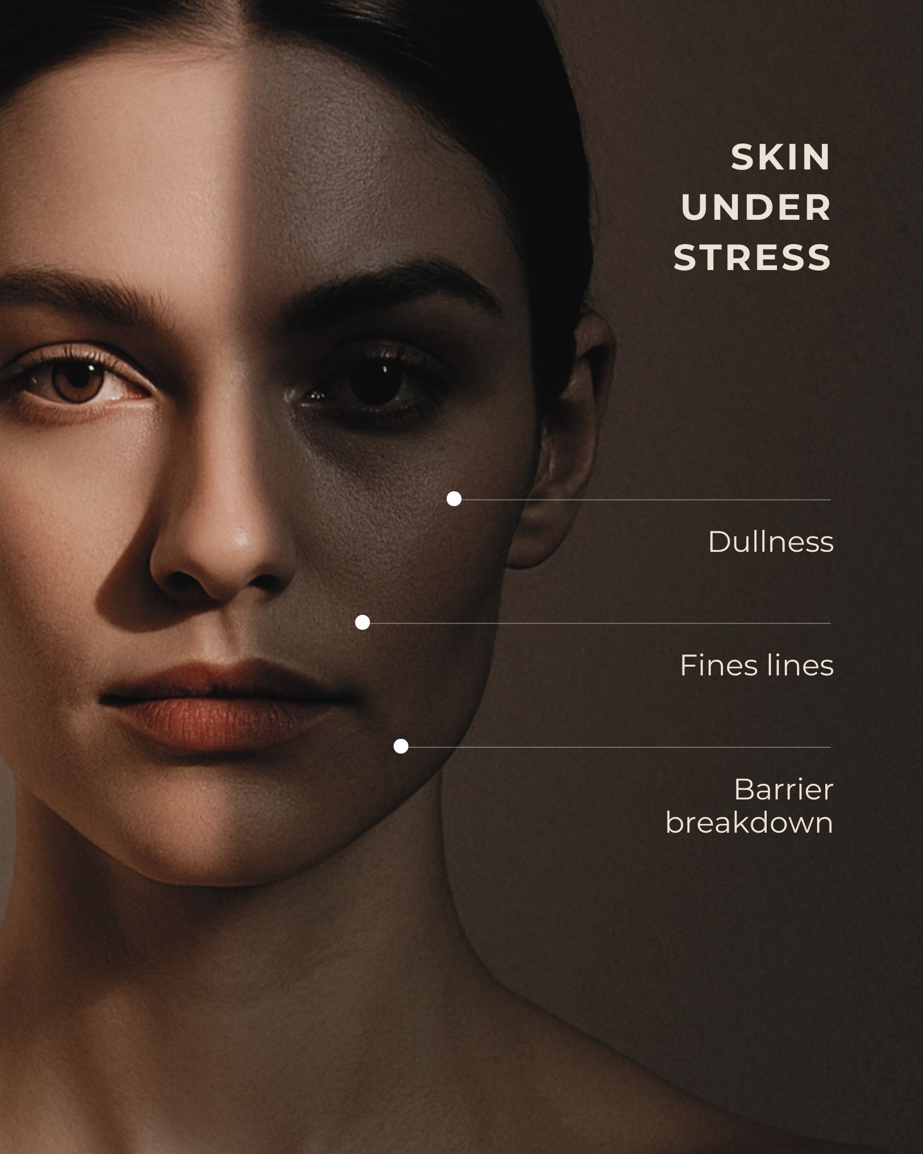 When stress hormones rise, your skin’s barrier weakens. Cortisol breaks down collagen and slows cellular repair, leading to dehydration, inflammation, and dullness. This is why your complexion might lose its brightness or feel more sensitive after long, high-stress periods. Environmental shifts — travel, cold weather, or lack of sleep — amplify this effect. They create oxidative stress, which drains the skin of radiance and elasticity. The result? Fine lines, redness, and that hard-to-define sense of fatigue that even makeup can’t mask.