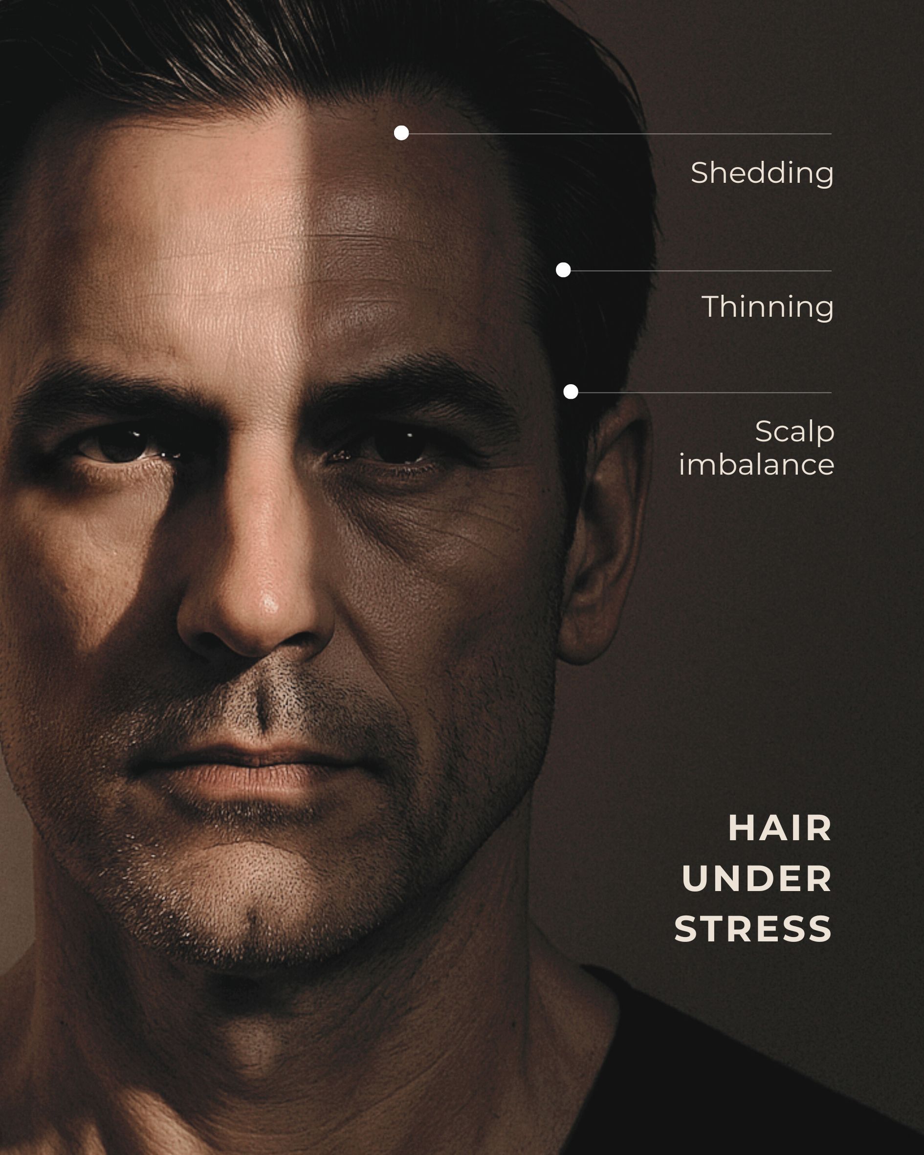 Hair and scalp health are equally sensitive to stress. When the body feels pressure, blood flow to the scalp decreases, and hair follicles shift prematurely into the shedding phase. For men, this can accelerate thinning; for women, it often shows as diffuse shedding or scalp sensitivity. Hormonal imbalances, especially around the end of the year or during lifestyle changes, intensify the issue; a perfect storm of physical and emotional strain.